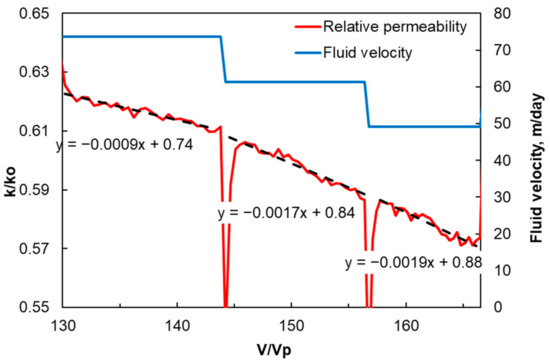 Change in relative permeability of sample IEKEV5602 during deionized water injection. Dashed black lines show linear approximations with equations. The slope of the permeability curve at high fluid velocity is less than at lower fluid velocities, this can be seen from the linear function coefficient, the greater the absolute value of the coefficient, the more intensively the permeability decreases.