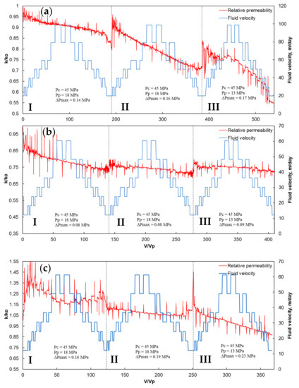 In addition, permeability degradation can occur due to creep. To assess the effect of creep on the change in permeability after the first injection cycle, the IEKEV5602 sample was left in the core holder for 60 h at a constant pore and confining pressure, and after exposure, more than 100 pore volumes were injected at rates of 1 and 2 cm3/min (Figure 4). It is seen that, at the beginning of injection, after a pause, the permeability has a slightly higher value than at the end of the previous injection cycle, which can most likely be explained by disturbances and the occurrence of counter flows inside the sample during exposure. A similar phenomenon was observed later on other samples during kerosene injection and is especially pronounced when the pore pressure changes. Figure 4c also shows that when injection is resumed, the decrease in permeability at the beginning occurs quite intensively, as in the first cycle, but tends to stabilize. When the flow rate was increased to 2 cm3/min, the permeability slightly increased and immediately stabilized. In this case, the mobilization and retention of colloids are equivalent to each other, or colloids migration has completely stopped [65].