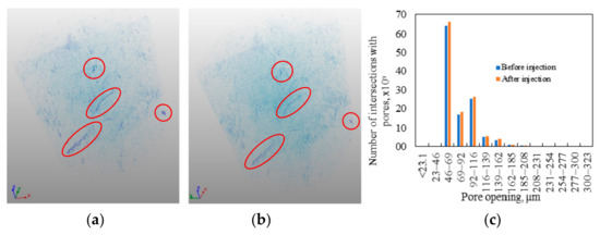 Voids in the IEKEV2517 sample, (a) before coreflooding; (b) after coreflooding. Red circles mark large voids that have undergone the greatest change after fluid injection. Shades of blue show cracks, matrix not shown; (c) pore opening distribution histogram before and after injection.