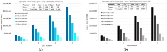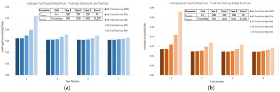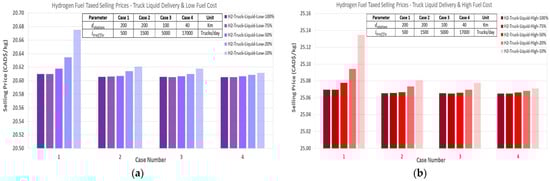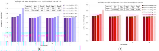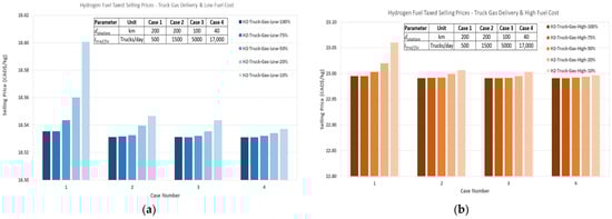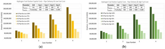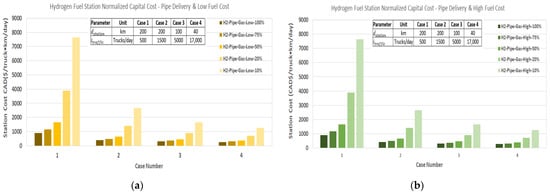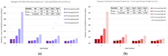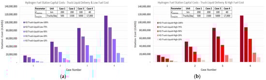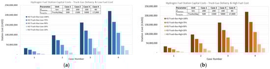 Figure 15a,b Capital costs are not reliant on fuel costs; thus, high and low fuel price profiles contain the same data for each scenario. As expected, the capital cost increases with increasing traffic rates including technology integration and through Cases 1 to 4; this is due to the capital costs that rely on the traffic rate. It is apparent that the gaseous truck delivery of hydrogen requires higher capital costs than liquid truck delivery. This is because of the significantly higher cost of storage per kilogram of gaseous hydrogen compared to that of liquid hydrogen (