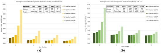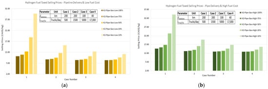 Table 5) and, thus, lower maintenance cost (Equation (13)). Comparing truck and pipeline delivery, it can be noticed that pipeline delivery generally has a much lower selling price, with the exception of 10% technology integration in Case 1. The rapid increase of this specific case is because of the high capital costs associated with pipeline equipment that need to be recovered and, given a low traffic rate, selling prices must be increased exponentially compared to truck delivery. Aside from this case, the low selling price of pipeline-delivered fuel is due to eliminated high commodity delivery costs that are associated with truck delivery.