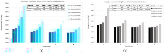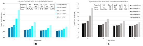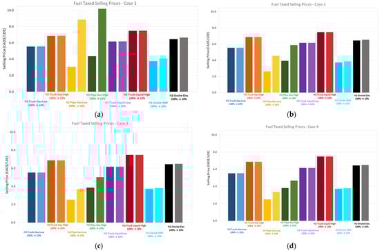 Figure 10a,b present the taxed fuel selling prices derived from the techno-economic model presented in
