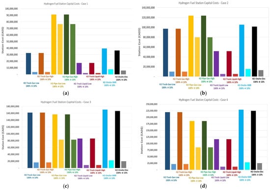 A sensitivity analysis was performed on the 40 scenarios, including the parameter variance by case (Cases 1–4), in order to investigate the effect of refuelling stations’ capital cost reduction on the selling price of hydrogen. The aim of this sensitivity analysis was to predict the selling price based on future hydrogen infrastructure resulting from economies of scale. For each case, the project capital cost was reduced between 5% and 25% in 5% increments, and the selling price of hydrogen was re-calculated. Results indicate that reductions in capital cost variations in the range from 5% to 25% result in hydrogen taxed selling price reductions in the range from 0.10% to 16.21%. The detailed analysis for the main scenarios is provided in
