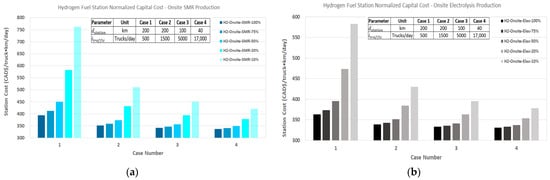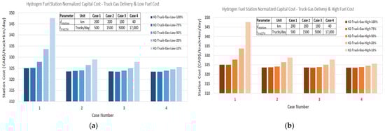 Figure 20a,b present the normalized costs. As expected, given Equation (7), the normalized capital cost has an inverse relationship with traffic and distance between stations and a linear relationship with capital cost and, therefore, does not rely on hydrogen cost. Thus, the normalized cost decreases with increasing technology integration and through Cases 1 to 4.