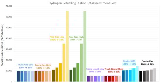 In summary, truck-delivered hydrogen stations offer, in general, the lowest total investment cost. At 100% technology integration, the total investment cost varies between CAD 5125 million and CAD 10,927 million, comprising a normalized capital cost in the order of 174–911 $/truck/km/day. On the other hand, at 10% technology integration, the cost ranges between CAD 5273 million and CAD 65,429 million, comprising a normalized capital cost of 196–7644 $/truck/km/day. The highest is shown by pipe-delivered hydrogen and onsite hydrogen production processes using high technology integration methods.