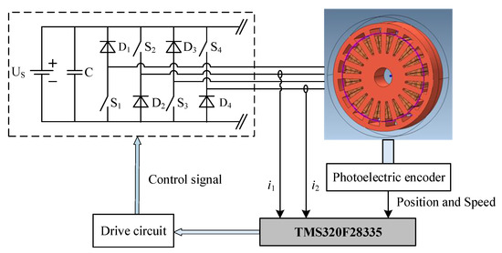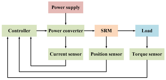 The working principle of OSRMs is the same as that of inner-rotor SRMs, which follows low reluctance principle, and the magnetic flux is always closed along the path of minimum reluctance [16]. Switched reluctance drive (SRD) is generally composed of SRM, a power converter, a digital controller, a position sensor, a current sensor and torque sensor, as shown in Figure 1 [17]. The controller detects the relative position between the stator and rotor of SRM from the position signal provided by the position sensor, so as to select the excitation phase. According to the phase current from the current sensor, the current value of the current excitation phase is calculated, and the collected current is converted into digital signal and sent to the controller for calculation. The torque ripple provided by the torque sensor can be used in direct torque control, torque ripple suppression, and output power tests.
