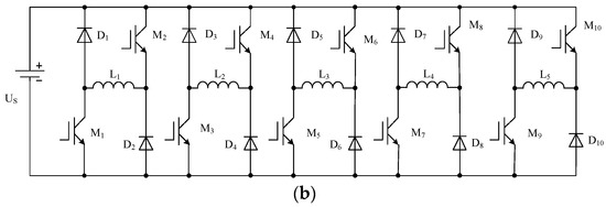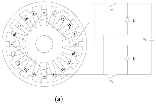 In this paper, an 8 kW five-phase 20/16 pole OSRM is considered for theoretical analysis, simulation, and experimental verification. Figure 2a shows the single-phase circuit structure of the motor with an asymmetric half bridge; Figure 2b shows the overall drive circuit, where each phase is independently controlled, leading to high reliability. The torque ripple of OSRM is large, mainly due to the characteristics of commutation excitation. However, the problem of large torque ripple can be solved by optimizing the designs of the motor body and motor control. When the ORSM is applied as the wheel hub motor of an EV, the motor can directly drive the wheel without a traditional power transmission system. Such a design can achieve small volume, high power and high efficiency, simplify the whole vehicle structure, reduce the whole vehicle weight, and is conductive to increasing the speed control range of EVs [18].