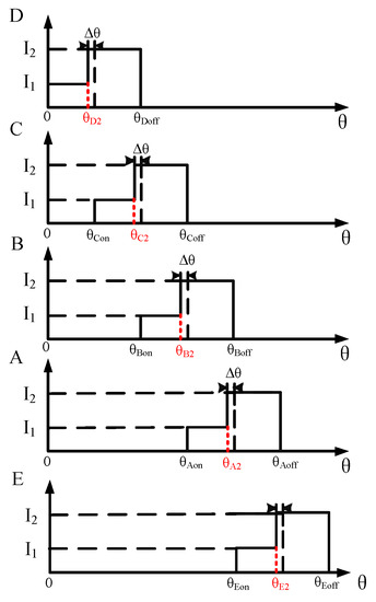 Considering the large torque ripple in the traditional excitation method, a step current excitation mode is proposed, as shown in Figure 5, where I2 is the rated phase current reference, I1 is the designated portion of the reference current I2, c is the proportional reduction coefficient, and Δθ is the overlap angle of excitation phase between preceding phase and the phase followed. So, I1 indicates the first half of current excitation and I2 indicates the second half of current excitation. Although the step excitation current mode reduces the tangential force of the overlapping part during two-phase excitation through the step current, it can effectively reduce the torque ripple.