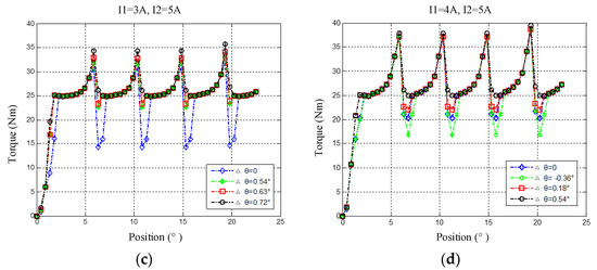 Torque characteristics: (a) I1 = 1 A, c = 0.2; (b) I1 = 2A, c = 0.4; (c) I1 = 3 A, c = 0.6; (d) I1 = 4 A, c = 0.8.