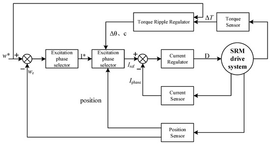 The control block diagram based on step current excitation mode and the traditional SRM double closed-loop control is shown in Figure 9. In the double closed-loop control structure of the outer current loop and the inner speed loop, a torque ripple regulator is added. According to the given speed w*, the calculated Iref and the real-time calculated △T, the optimal Δθ and c are determined, and the minimum △T is obtained by adjusting the stepped current excitation to realize the torque pulsation suppression.