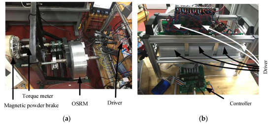 A OSRM drive system platform was built based on the TMS320F28335 micro-controller. According to the position signal read by the photoelectric encoder, the excitation phase was determined. According to the real-time phase current and speed, the corresponding driving signal was calculated and output through the controller. A speed regulation experiment was carried out. The structure block diagram of the speed regulation system of a five-phase 20/16 pole OSRM is shown in Figure 10, and the platform of the speed regulation system prototype is shown in Figure 11. The speed regulation experiment of the five-phase 20/16 pole OSRM included start-up, speed regulation without load, speed regulation with load, mechanical characteristics measurement, and efficiency calculation, which will be presented in the following subsections.