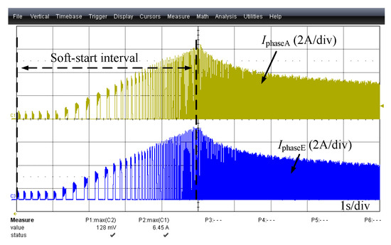 Five seconds before the start-up of OSRM, the soft start was set to limit the current increase rate, that is, the current of each phase was controlled to rise slowly according to the given step, so as to avoid an excessive starting current. The current waveforms of phase A and E during the start-up process are shown in Figure 12, where both phase currents rise in a controlled manner within the limit.