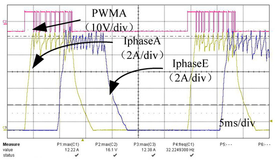 When the speed is higher than the rated speed, CCC (Current Chopping Control) is used for drive control. The phase current waveform and drive signal are shown in Figure 13. The driving signal PWMA of phase A winding corresponds to the phase A current. When IphaseA < Iref, PWMA is 16 V, and IphaseA increases. When IphaseA > Iref, PWMA is −8 V, IGBT is turned off, and IphaseA decreases until IphaseA < Iref. The phase A current can be controlled to track Iref.