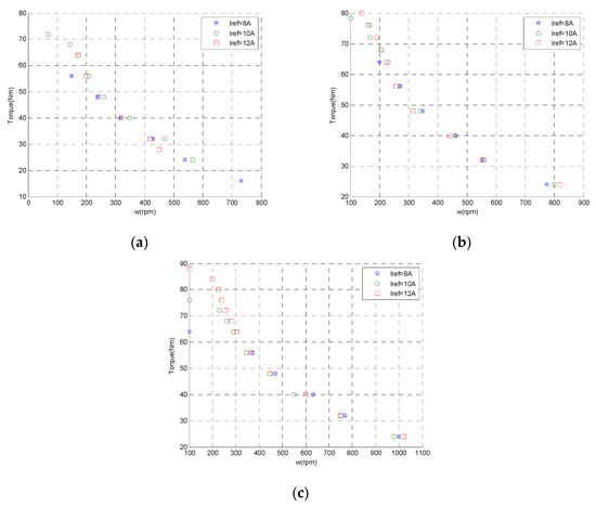 The mechanical characteristic curve is shown in Figure 14. Three groups of tests with load and different turn-on angles were carried out for three reference currents Iref. It can be established that using the same power supply, the load carrying capacity with a turn-on angle interval between 10.8° and 17.55° shows best torque performance; where the turn-on interval reaches the maximum limitation. Therefore, the turn-on angle interval between 10.8° and 17.55° was selected for the following speed regulation test experiment and efficiency test.