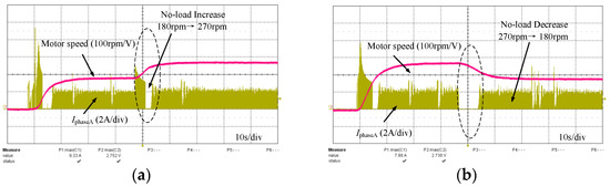 Since the proposed ORSM is intended to be applied in commuter and logistics applications, the speed range from 100 r/min to 300 r/min was verified in the experiments. The double closed-loop control method of speed outer loop and current inner loop was adopted. Figure 15a shows the speed acceleration experiment without load from 180 r/min to 270 r/min, and Figure 15b shows the deceleration experiment without load from 270 r/min to 180 r/min. The motor phase current was still large after its soft start. When the motor speed reached the reference speed, a non-excitation interval occurred; this usually occurs at start-up and speed regulation.