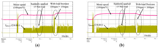 Figure 16a shows the speed acceleration experiment with a 15 Nm load from 100 r/min to 150 r/min, and Figure 16b shows the deceleration experiment with the same load from 150 r/min to 100 r/min. When the motor starts up and runs stably, the motor can run normally with a load of 15 Nm, with the speed unchanged. In the case with load, the non-excitation interval also appeared during acceleration (and deceleration), and the speed regulation remained stable.
