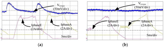 Figure 17 shows the experimental results of the OSRM torque ripple characteristics in the traditional current excitation mode and the new step current excitation mode under the state of w = 300 r/min and I2 = 10 A. The traditional excitation current mode produced Vpp = 127.6 mV and T = 5.104 Nm, and the new step excitation current mode produced Vpp = 31.4 mV and ΔT = 1.256 Nm. The experimental results showed that the new step current excitation method can reduce the OSRM torque ripple and further optimize the OSRM torque ripple by adjusting the parameters of the reference current and excitation phase overlap angle [2].