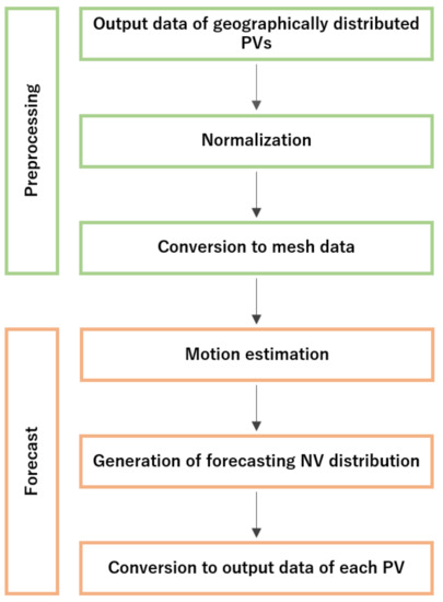 The proposed method uses motion estimation, which is an image processing method. To apply the motion estimation to forecast the output of geographically distributed PV systems with various power ratings and forms, the output power data were normalized and converted to mesh data. The following process was implemented to achieve this.