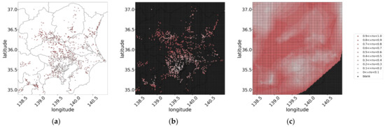 Concept of conversion to mesh data on 14 July 2014: (a) actual geographical distribution of normalized values (NVs); (b) mesh-arranged geographical distribution converted from (a); (c) interpolated mesh data.
