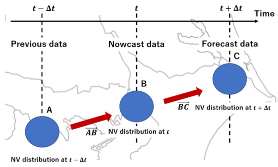 Figure 4 illustrates the motion estimation concept. Using the optical flow method, vector AB representing the NV of location A at time and then moved to location B at time is estimated. Assuming that the movement is a constant velocity linear motion and persists until , vector BC is obtained by moving vector AB in parallel. The forecasting distribution of all mesh at time is obtained by interpolating the location of C from each NV obtained from vector BC.