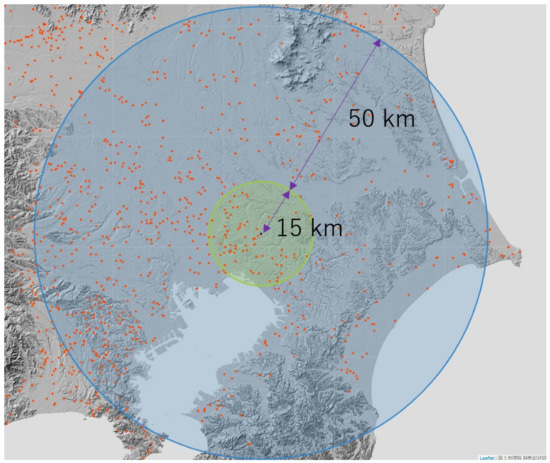 The forecast error is evaluated in a certain area, which is shown by the green circle in Figure 5, in the Kanto Region with 101 PV systems while varying , which is the parameter in the motion estimation, to minimize the error caused by the interpolation process. Table 3 summarizes the dataset of the evaluated area. The central point of the evaluated area is located at . Figure 4 depicts the area, wherein the green circle with a radius of 15 km denotes the evaluated area, and the blue circle with a radius of 65 km indicates the area that has probably been used to estimate NV distribution in the green area.