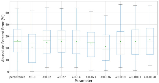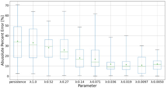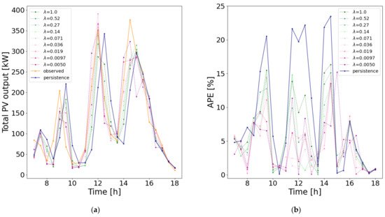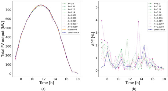 The authors have applied the same forecasting method in other two regions in Japan: 122 PV systems in Kansai region and 26 PV systems in Chubu region. Furthermore, in these two regions, the forecasting errors by the proposed method with the best parameter ( in the case of Kansai region and in the case of Chubu region) were ~50% lower than those by the persistence forecast [31]. Therefore, it is confirmed that the proposed method is effective for forecasting periods with a drastic change in output power.