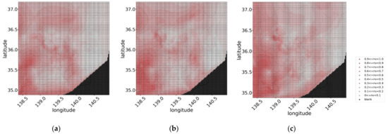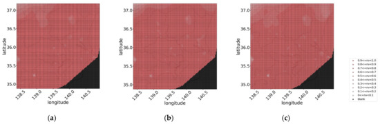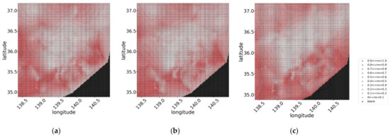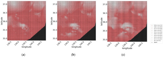 In the proposed method, the irregular geographical distribution of NV values is converted to a mesh distribution, which is the distribution data aligned at equal intervals in the east–west and north–south directions to adapt it to image processing methods. The NV value of each parcel in the regularly arranged distribution with equally spaced widths of latitude and longitude were obtained from the average of the NVs of PV systems located in the parcel. In this study, the width of the mesh was set to in latitude and longitude, based on the reports of a previous study [22]. Figure 3 depicts the conversion diagram to mesh data; Figure 3a shows the actual locations of the PV systems and their NVs at 11:00 on 14 July 2014, are classified by color, and Figure 3b shows the mesh distribution at that time. In Figure 3b, the parcels with no corresponding PV are considered blank values and are indicated in black. If several blank values exist in the mesh data, the motion estimation cannot be performed. Therefore, we performed interpolation (Figure 3c) based on Delaunay triangulation using “grid data”, which is a function of MATLAB 2020a [27].