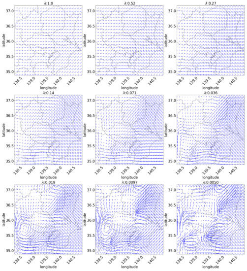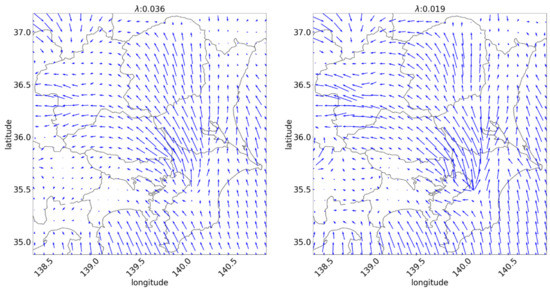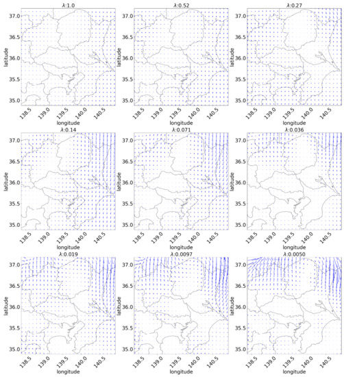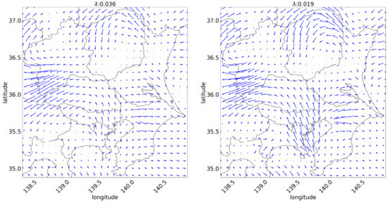 First, an example is presented and explained such that the result of the proposed forecasting is substantially better than that of the persistence forecasting. Figure 13 depicts the box plot of the estimation error at 12:00 on 21 March 2014. It indicates that the proposed forecasting with a large parameter does not reduce the error compared to persistence forecasting. Parameter is associated with the unity of the vector distribution. Figure 14 depicts three NV distributions at the period, which shows a lump of low NVs in the center that expands, and the spread of NV is non-uniform depending on the direction. In this case, the forecast can be improved with a low estimation that considers local motion. Figure 15 is the estimated flow visualization with different . It shows that the motion vectors which is yielded with high values are too short compared with the practical motions of the lump in Figure 14. However, divergence vector is too large and certain vectors cross each other when is too small in Figure 15, which is also considered to be unnatural because weather changes caused mainly by cloud motions are not considered to intersect. On the other hand, the motion vector distributions with have few vector crossings and the fine movement, so they seem to be appropriate.