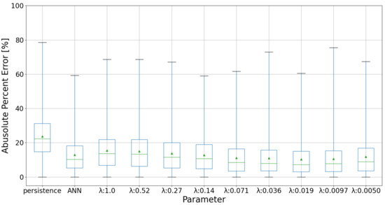 The estimation results of the proposed forecasting evaluated the motion estimation parameter and compared it with the persistence forecasting and ANN for periods when the output power varied drastically. Note that in this section, the ANN results are for the 96 units that could be forecasted in the ANN. Figure 12 depicts a box plot of the estimation errors for the periods in the evaluated area, Table 6 shows the mean, median, and standard deviation of the errors. In the case of persistence forecasting, the mean was 23.7%, and the median was 22.2%, and for the ANN, the mean was 13.0% and the median was 10.2% In the case of proposed forecasting with the best motion estimation parameter , the mean was 10.3%, and the median was 7.20%. In other words, the means of the proposed forecasting with the best parameter reduced in comparison with the persistence forecast (by 56.6%) and the ANN (by 20.8%).