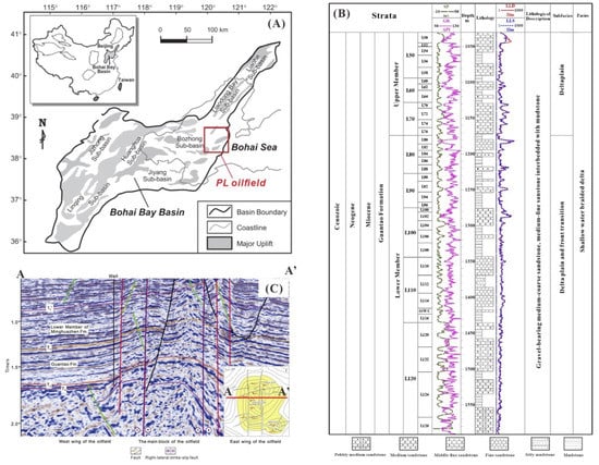 (A) The location of the PL Oilfield [30]. (B) The geologic column of the Guantao Formation in well PL19−3−b. (C) PL: The E−W seismic profile of the PL oilfield is steep in the west and slow in the east [29].