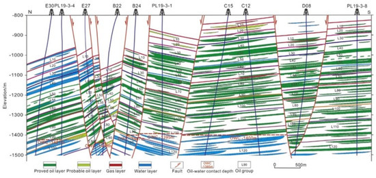 The reservoir rocks of the PL Oilfield are the Neogene Guantao (Ng) and Lower Member of Minghuazhen (Nm) formations of sandstone with a shallow burial depth (from −745 m to −1540 m). This oil field is divided into 13 oil-bearing groups and 47 small layers (Figure 1B). The oil-bearing interval of the lower Minghuazhen formation is divided into five oil groups (L00~L40 oil groups), the upper Guantao formation is divided into three oil groups (L50~L70 oil groups), and the lower Guantao formation is divided into five oil groups (L80~L120 oil groups) (Figure 1B). Oil and gas distribution is controlled by the distribution characteristics of sand bodies and can be classified as a typical lithologic-structural reservoir (Figure 2).