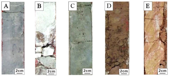 Mudstone color of well PL−19−H. (A) Gray mudstone, L124, 1713.4 m. (B) Light gray mudstone, L100, 1475.3 m. (C) Gray green mudstone, L50, 1180.5 m. (D) Brown red mudstone, L70, 1304.6 m. (E) Red mudstone, L120, 1574.8 m.