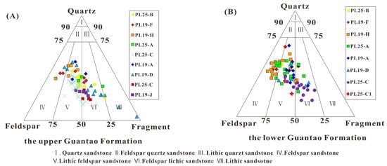 Sandstone composition triangle. (A) The triangle chart of sandstone classification in the upper Guantao Formation. (B) The triangle chart of sandstone classification in the lower Guantao Formation.