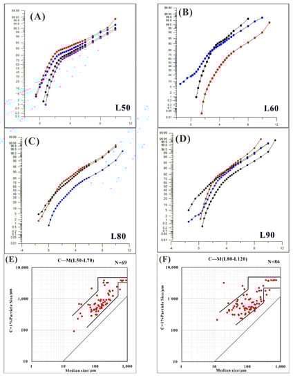 The probability cumulative grain size curves and C−M diagram. (A) The probability cumulative grain size curves of the PL19−3−A well. (B) The probability cumulative grain size curves of the PL19−3−B well. (C) The probability cumulative grain size curves of the PL25−C well. (D) The probability cumulative grain size curves of the PL25−C well. (E) C−M diagram of the upper Guantao Formation (L50−L70, N = 69). (F) C−M diagram of the lower Guantao Formation (L80−L120, N = 86).