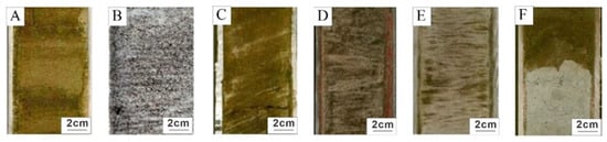 Typical sedimentary structure. (A) Graded bedding, PL19−3−H, 1059.2~1059.9 m. (B) Parallel bedding, PL25−6−C, 1450.5 m. (C) Tabular cross-bedding, PL19−3−F, 1190.5 m. (D) Crescent type cross bedding, PL19−3−F, 1181.3 m. (E) Sand cross bedding, PL19-3-F, 1166.2 m. (F) Erosional basal surface, PL19−3−D, 1364 m.