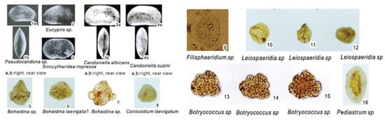 Paleontological analysis confirmed the presence of Bohaidina, Para-bohaidina, Filisphaeridium, Sentusidinium, Granodiscus, and Leio-spaeridia (Figure 7), representing shallow lacustrine facies in the green mudstone of the Guantao Formation, and the fossils of lacustrine assemblage such as Pseudocandona and Sinocytheridea impressa indicate that the oilfield changed from a fluvial environment to a shallow lacustrine environment [29].