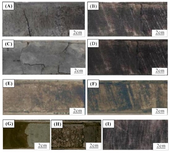 The sedimentary structure reflects the deposition rate, hydrodynamic strength, and depositional medium so the sedimentary structure can be used to determine the environment when the rock was formed, and then the further divide in the depositional environment. On the basis of core observation, there are sedimentary structures such as granular sequence bedding (Figure 6A), parallel bedding (Figure 6B), plate cross bedding (Figure 6C), trough cross bedding (Figure 6D), corrugated cross bedding (Figure 6E), and a scoured surface (Figure 6F), which demonstrate that the hydrodynamic strength changes greatly.