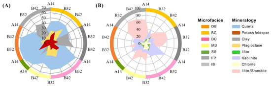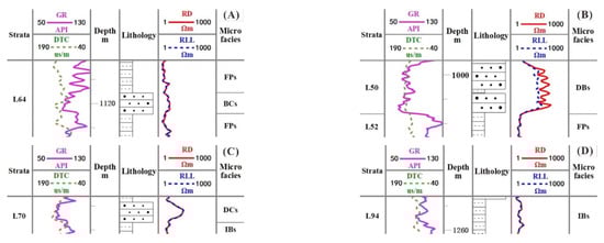 BC is a common type of microfacies in delta plain deposits, deposited in the area between DB. BC sand bodies are mainly gray, off-white medium-fine-grained feldspar sandstone (Figure 8A). BCs mainly developed through cross-bedding, followed by plate cross-bedding (Figure 8B). This description indicates that the channel scour was strong and frequent during the sedimentary period. The BC sedimentary sequence has classic normal sequence characteristics. The GR curve is in the form of a serrated bell-shaped, small cylinder, or bell–cylinder combination, and the sand body has a wide distribution range (Figure 9A).