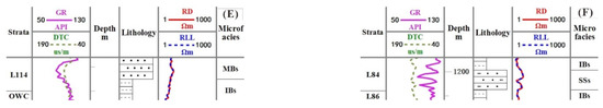 The SSs are mainly thin layers of gray or gray-black silt sandstones, which are often interbedded with argillaceous and vertical sediments. Parallel bedding, wavy bedding, and convolution bedding are more common, and the GR curves have features such as tines and finger features (Figure 9F).
