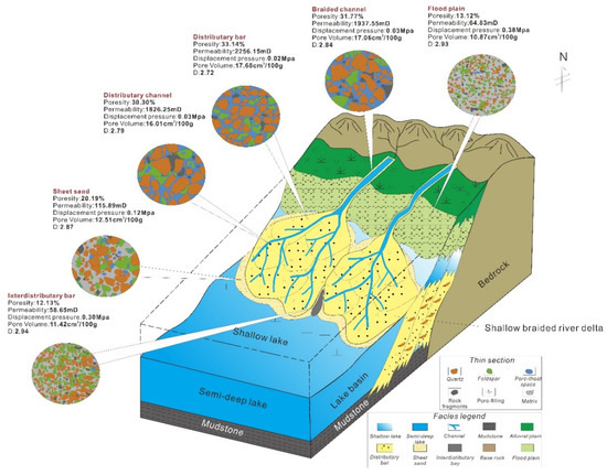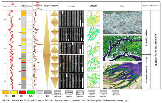 - A total of seven typical sedimentary microfacies were identified in the study area; distributary bars (DBs), braided channels (BCs), distributary channels (DCs), mouth bars (MBs), sheet sands (SSs), interdistributary bays (IBs), and flood plains (FPs).
