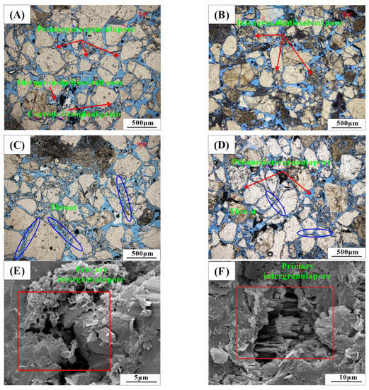 By means of casting thin sections and SEM, the reservoir space of the Guantao Formation was found to mainly comprise primary intergranular pores, followed by intergranular and intragranular dissolved pores (Figure 11A,D,E,F). Most of the pores are irregular and parts of the pores are filled with clay minerals (Figure 11E,F). In this study area, the primary intergranular pores account for more than 90% of the total pore volume. The throat type is point throat (Figure 11C), followed by necking and laminated throat (Figure 11B). The throat radius is generally between 0.01 mm and 0.03 mm.