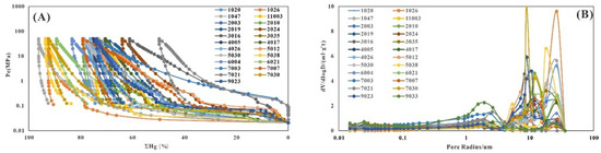 (A) Capillary pressure curves. (B) Pore throat radius distribution curve. The mercury intrusion curve is comprehensively controlled by the pore throat size, sorting, and skewness, and is a comprehensive reflection of the pore throat structure characteristics. (A) is the original mercury intrusion curve, and (B) is the pore size distribution curve calculated from (A).