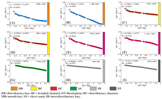 where Pc is the capillary pressure corresponding to the pore throat radius (r) (MPa); Pmin is the capillary pressure to the maximum pore throat radius (rmax) (MPa); SHg is the accumulative mercury saturation (%), and its slope can be used to calculate the fractal dimension using Equation (6) [38]: