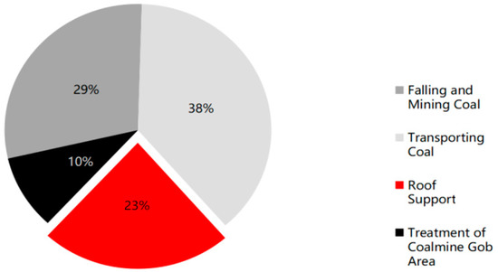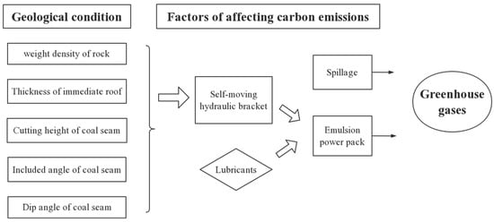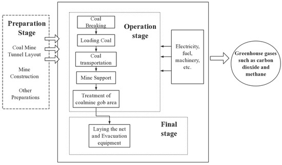 - Operation stage. The operation phase includes the entire coal mining process: coal breaking, coal loading, coal transportation, roof support, and treatment of the coal mine gob area. The entire process generates large amounts of carbon dioxide. is produced by the use of machines, electricity, escape, and spontaneous combustion under different geological conditions. The machines often used in the process are coal mining machines, scraper conveyors, and hydraulic pillars, which use electricity and produce some carbon emissions. Lubricants are also applied to the machines, which also produce small amounts of emissions [14,15,16].