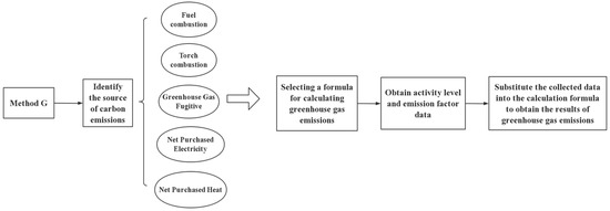 The specific ideas of the “Greenhouse Gas Emissions Accounting Methodology and Reporting Guide for China’s Coal Producers” (referred to as Method G) are shown in Figure 8. The Methodology and Reporting Guide for Greenhouse Gas Emissions of Chinese Coal Producers was commissioned by the China Development and Reform Commission and prepared by the National Center for Strategic Research and International Cooperation to address climate change. The compilation team drew on the research results and practical experience of GHG accounting reports of relevant enterprises at home and abroad and completed the compilation after field research and in-depth study. The Methodology and Reporting Guide on GHG Emissions of Chinese Coal Producers considers that there are five main sources of carbon emissions in the coal mining process: fuel combustion, flare combustion, GHG fugitive, net purchased electricity, and net purchased heat.