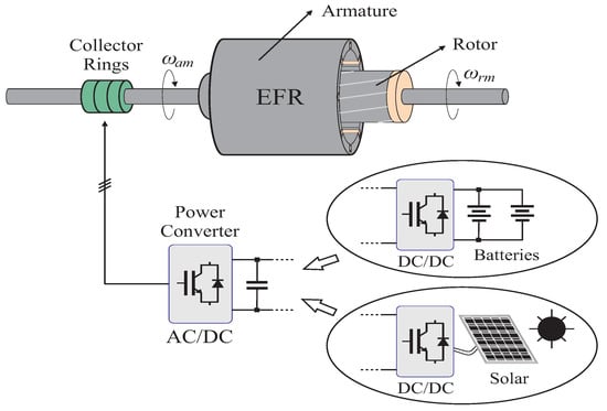 As seen in Figure 1, the EFR’s armature windings are connected to the output of a three-phase power converter through collector rings, which allows implementation of a system control strategy. EFR-based systems prevent electronic power devices from being connected directly to the power grid. In addition, the EFR device also makes it possible to implement a hybrid distributed generation system, since a secondary source such as a solar energy source and/or an energy storage system can be connected to the DC bus of the power converter as depicted in Figure 1, which allows power-sharing in the system.