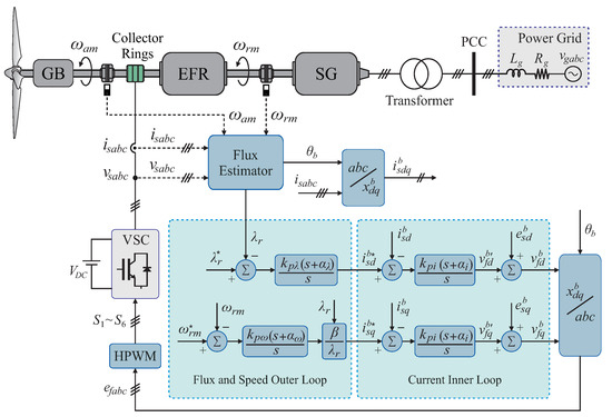 Figure 2 shows the topology and control scheme of the wind systems employed in this study. A wind turbine is mechanically coupled to the EFR’s armature axis using a gearbox (GB), since its speed is significantly lower than the rotating field speed needed to generate voltage at the grid frequency. A three-phase voltage-source converter (VSC) is employed to regulate the EFR’s armature current and provide a desired angular speed to the synchronous generator (SG) rotor despite the variable angular speed of the wind turbine. Due to the rotational motion of the EFR’s armature axis, collector rings are employed to connect the VSC to the armature windings terminals. The primary source of the EFR-connected converter (i.e., photovoltaic system with energy storage) is emulated by a DC voltage source. The SG stator windings are connected to the point of common coupling (PCC) through a three-phase transformer to adjust the generated voltage values to the power grid voltages. An ideal three-phase voltage source represents the power grid interconnected to the PCC through an equivalent grid impedance composed of series-connected inductor and resistor .