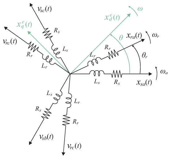 Figure 3 shows the armature and rotor variables in a natural reference frame and variables in an arbitrary reference frame. and represent the self-inductances of the armature and rotor windings, respectively, which also have intrinsic resistances equal to and .