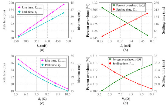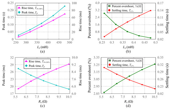 According to (46)–(49), the transient response specifications for the rotor speed depend on the EFR windings impedance parameters as well as on its parameters of inertia moments and friction factors. Figure 6 shows the behavior of these specifications assuming variations in the inductance and resistance values of the EFR armature. According to Figure 6a,b, when increases from 260 to 480 mH, the rise time, peak time and settling time increase, approximately, from 8 to 44 ms, from 25 to 145 ms and from 30 to 195 ms, respectively, while the percent overshoot decreases from % to %, approximately. On the other hand, according to Figure 6c,d, when increases from to , the rise time, peak time and settling time decrease from 24 to 16 ms, from 26 to 18 ms and from 33 to 23 ms, respectively, while the percent overshoot increases from % to %, approximately. Therefore, lower values for the ratio result in higher percent overshoot; however, their values were little affected by variations in the armature parameters. On the other hand, the values of the other transient specifications can be greatly influenced by these parameters.