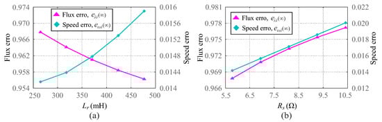 Figure 8 shows the flux and speed steady-state error values for variations of and . According to Figure 8a, for variations of between 260 to 480 mH, the flux error value decreases from to , while the speed error value increases from to , approximately. For variations of between to , the flux and speed error values increase from to and to , respectively, as shown in Figure 8b. Therefore, similar to the current error, variations in rotor inductance and armature resistance can also modify the steady-state response of the rotor flux and speed.